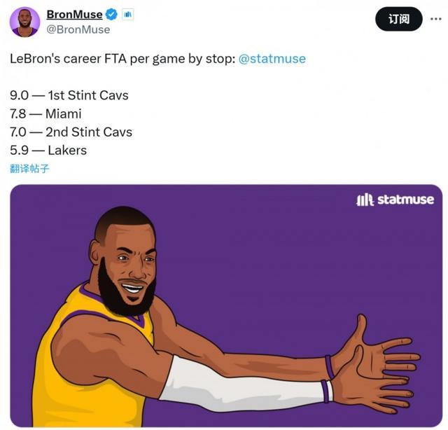 递减!詹姆斯场均罚球数:骑士1.0时期9次最多 湖人生涯仅5.9次